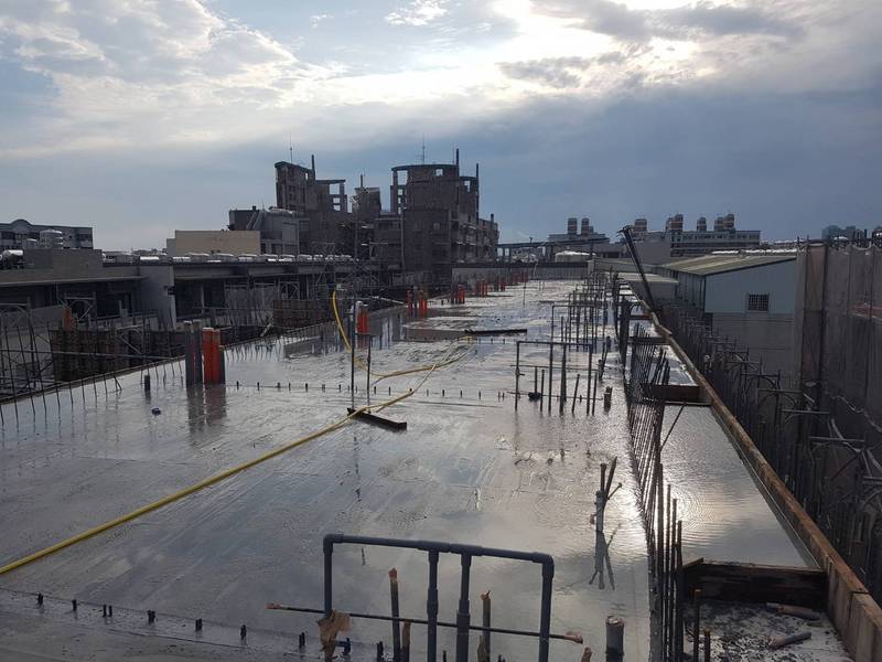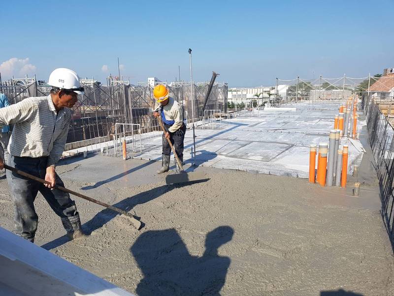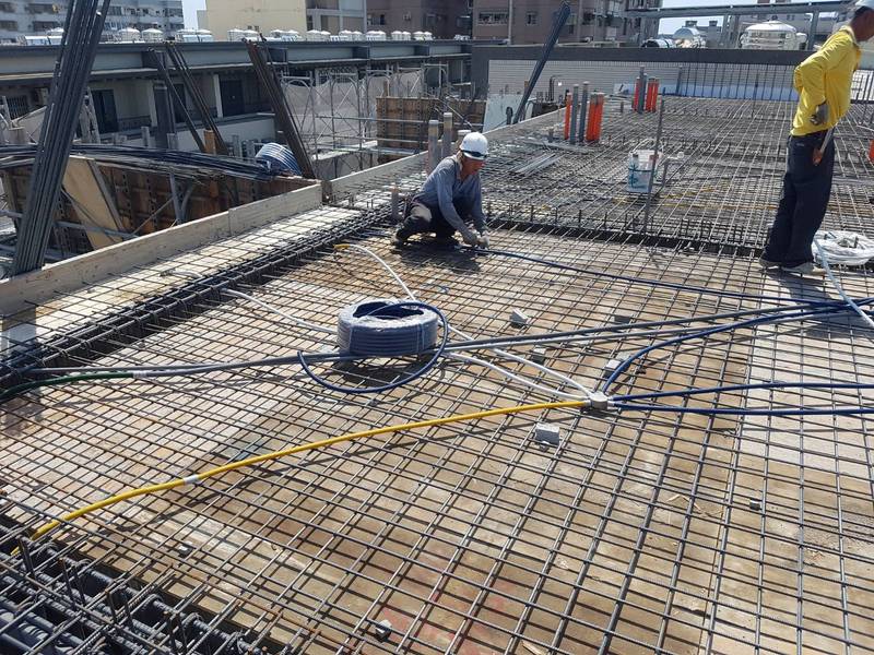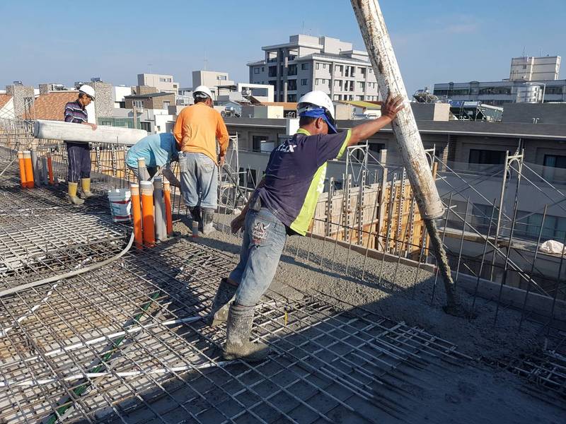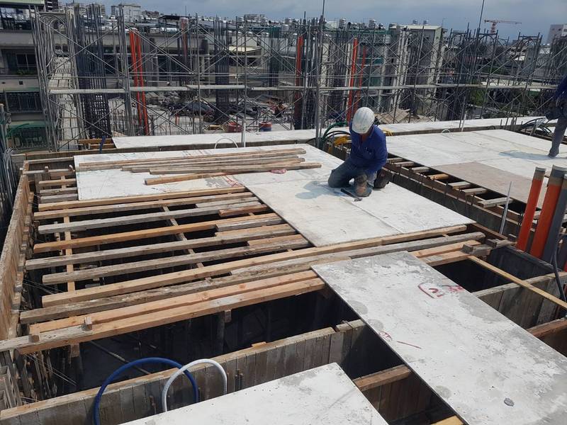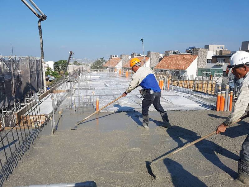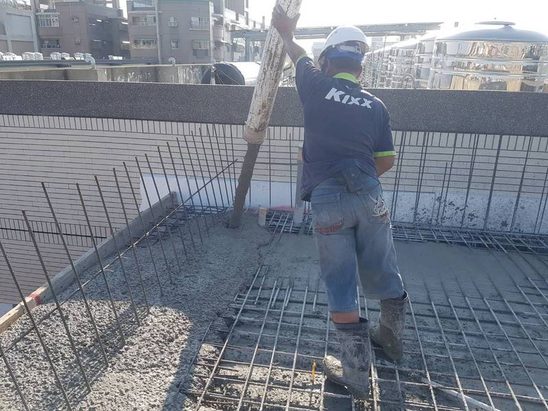 四樓頂版搗築混凝土,振動棒使用,減少蜂巢