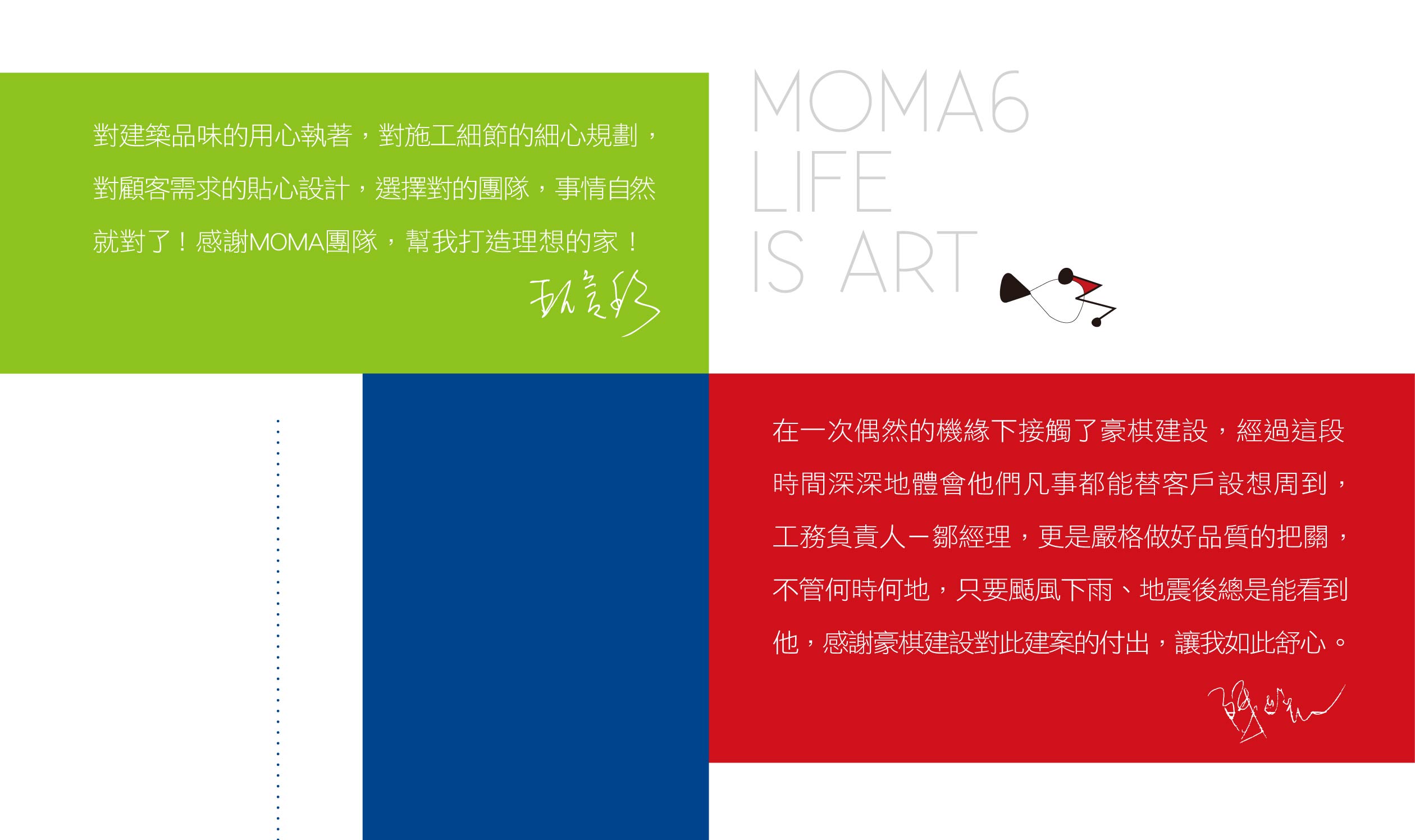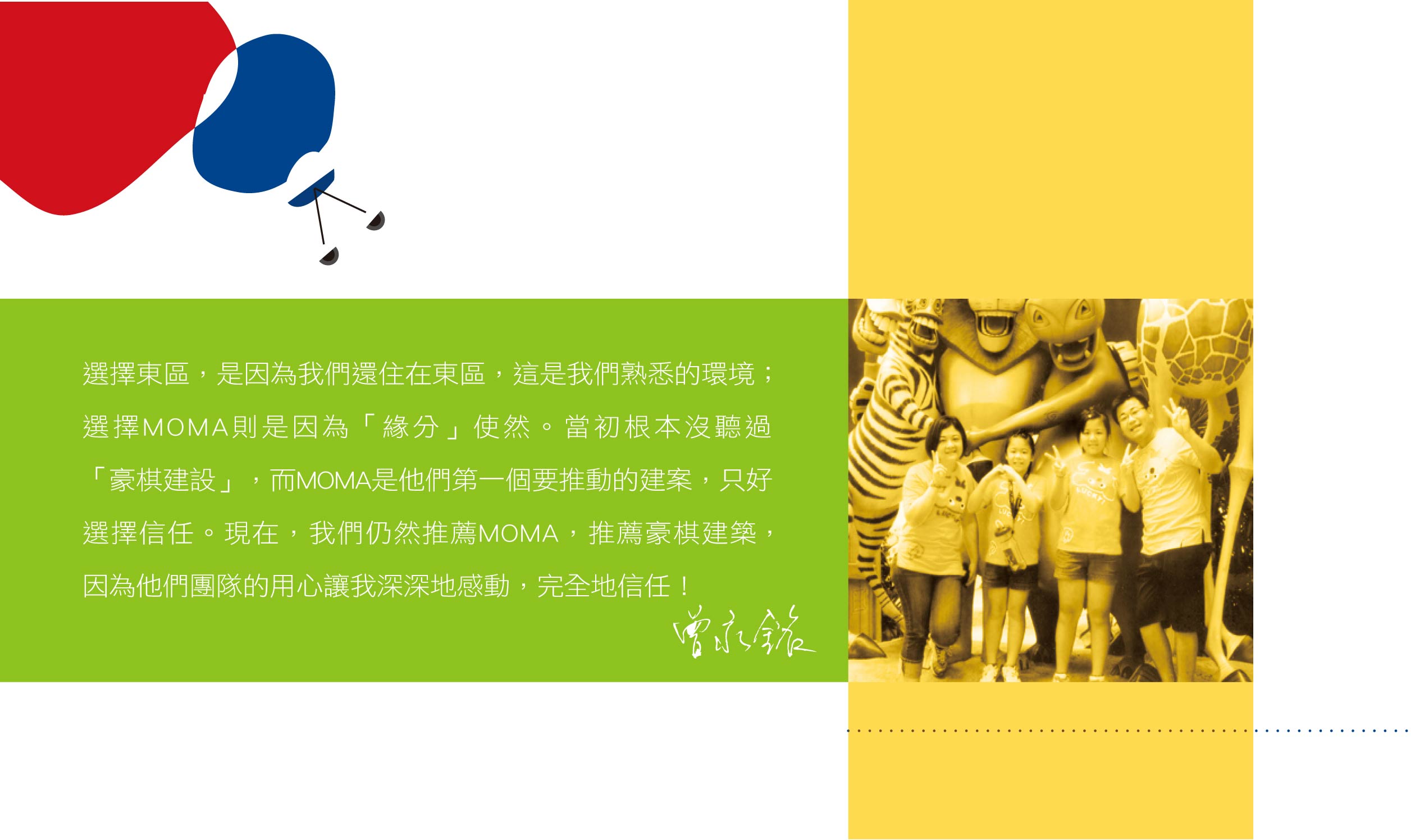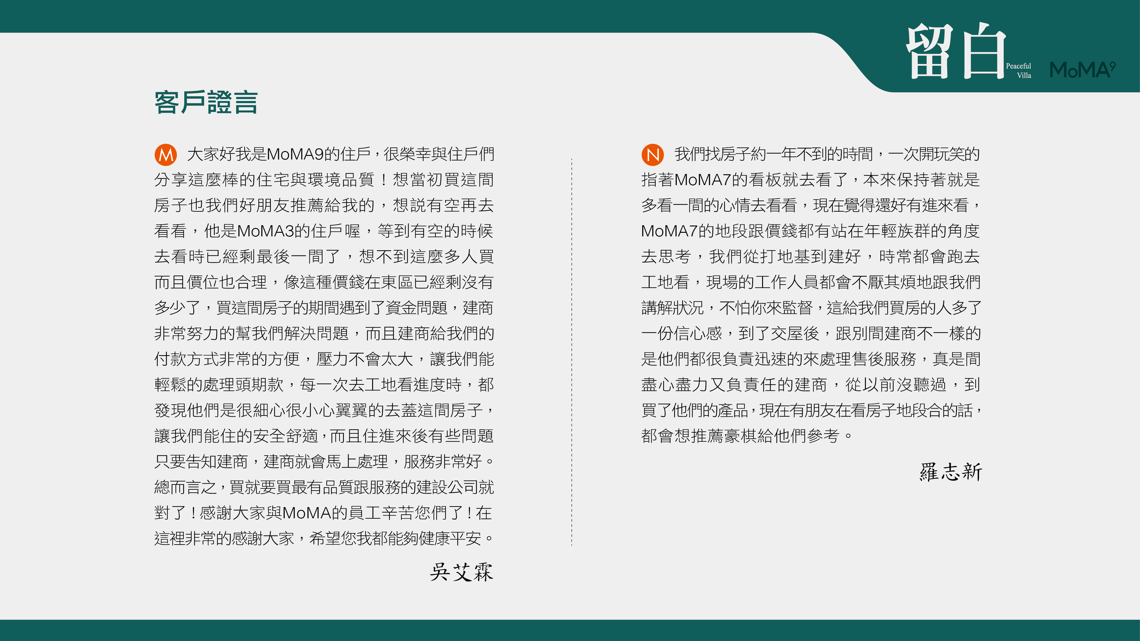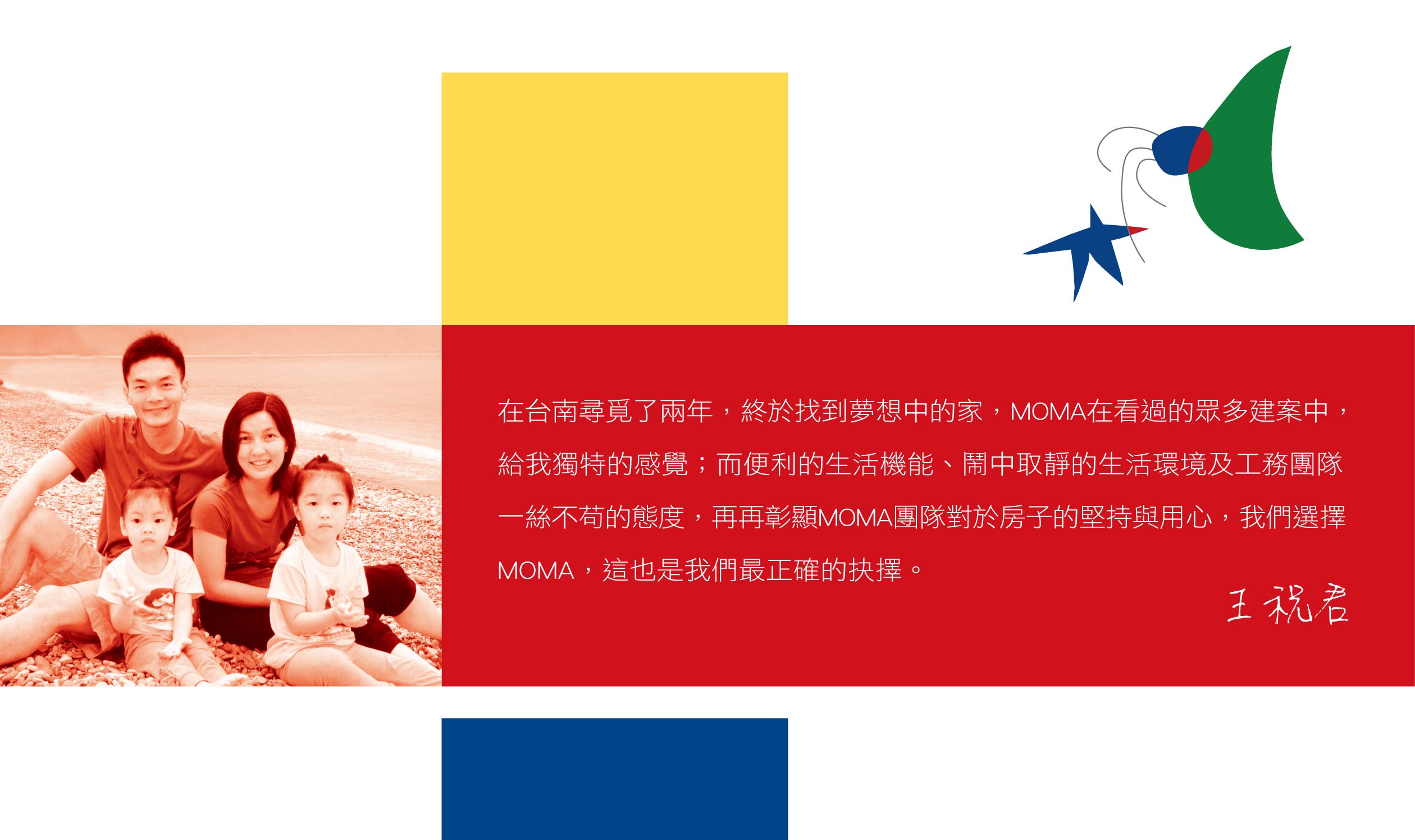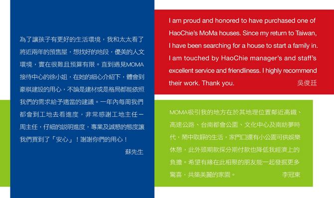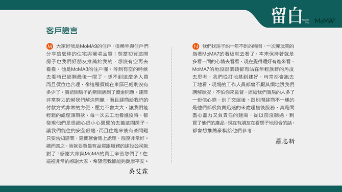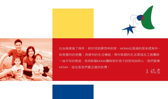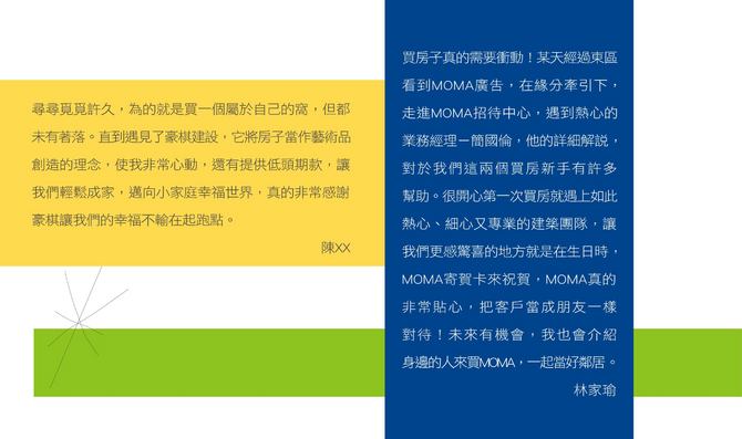 MoMA客戶薦言 【MoMA 1號.2號 作品】東區-2012年10月 【 MoMA 3號作品】東區-2013年3月 【MoMA 5號作品】東區-2013年5月 【MoMA 6號作品】東區-2015年10月 【MoMA 7號作品】東區-2015年10月 【MoMA 9號作品E區獨院透天-】東區-2016年9月 【MoMA 9號作品-G區精緻2房公寓】東區-2016年10月 【MoMA 11號作品-透天-歸仁真市心】歸仁區-2018年1月 【MoMA 12號作品-華廈-美美】歸仁區-2020年6月 【MoMA 12號作品-透天-築日】歸仁區-2020年7月 【MoMA 13號作品-透天-親親好墅】歸仁區-2020年3月 【MoMA 15號作品-獨院店住透天】東區-2020年12月 【MoMA 16號作品-精品透天】東區-2020年12月