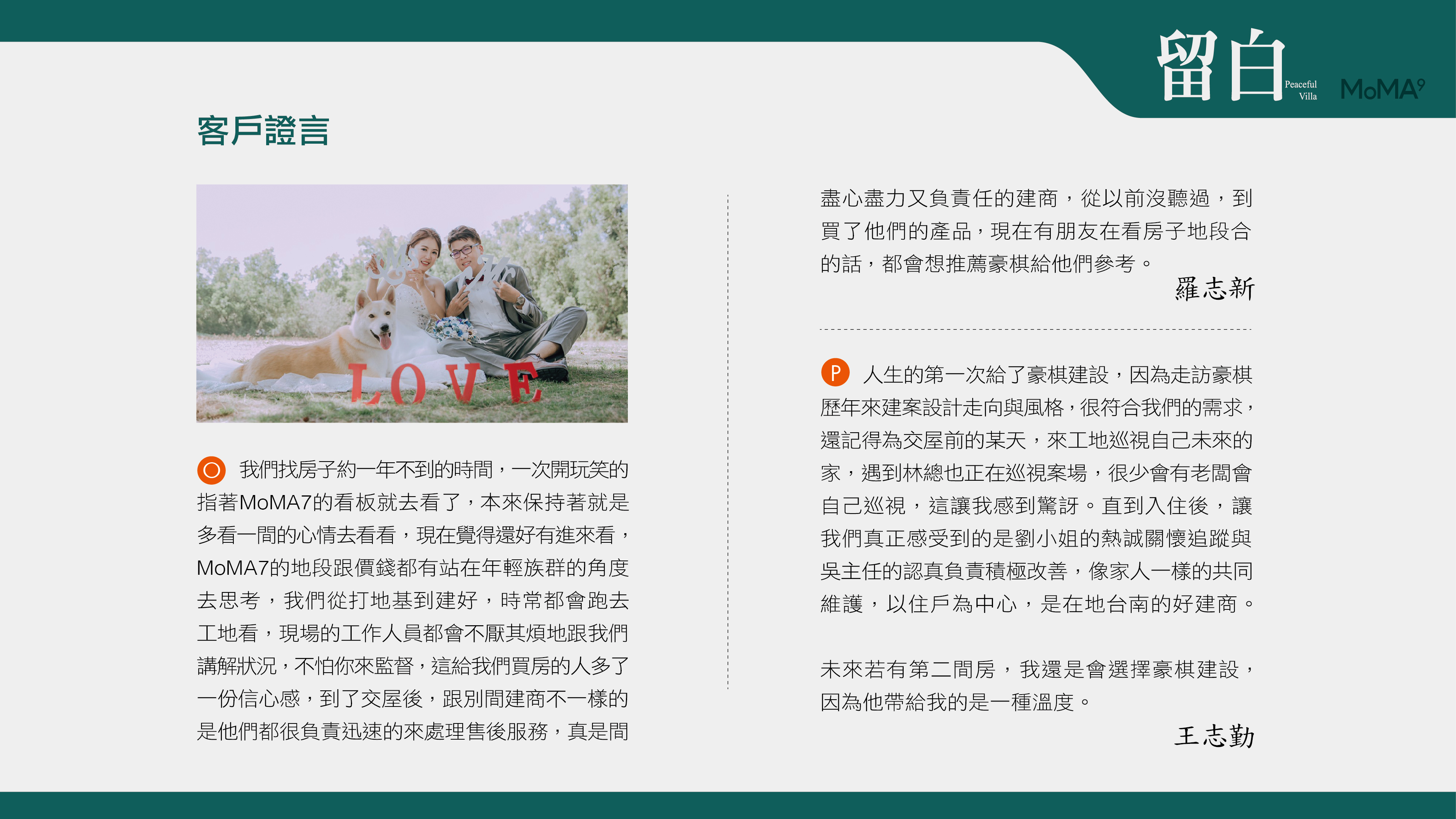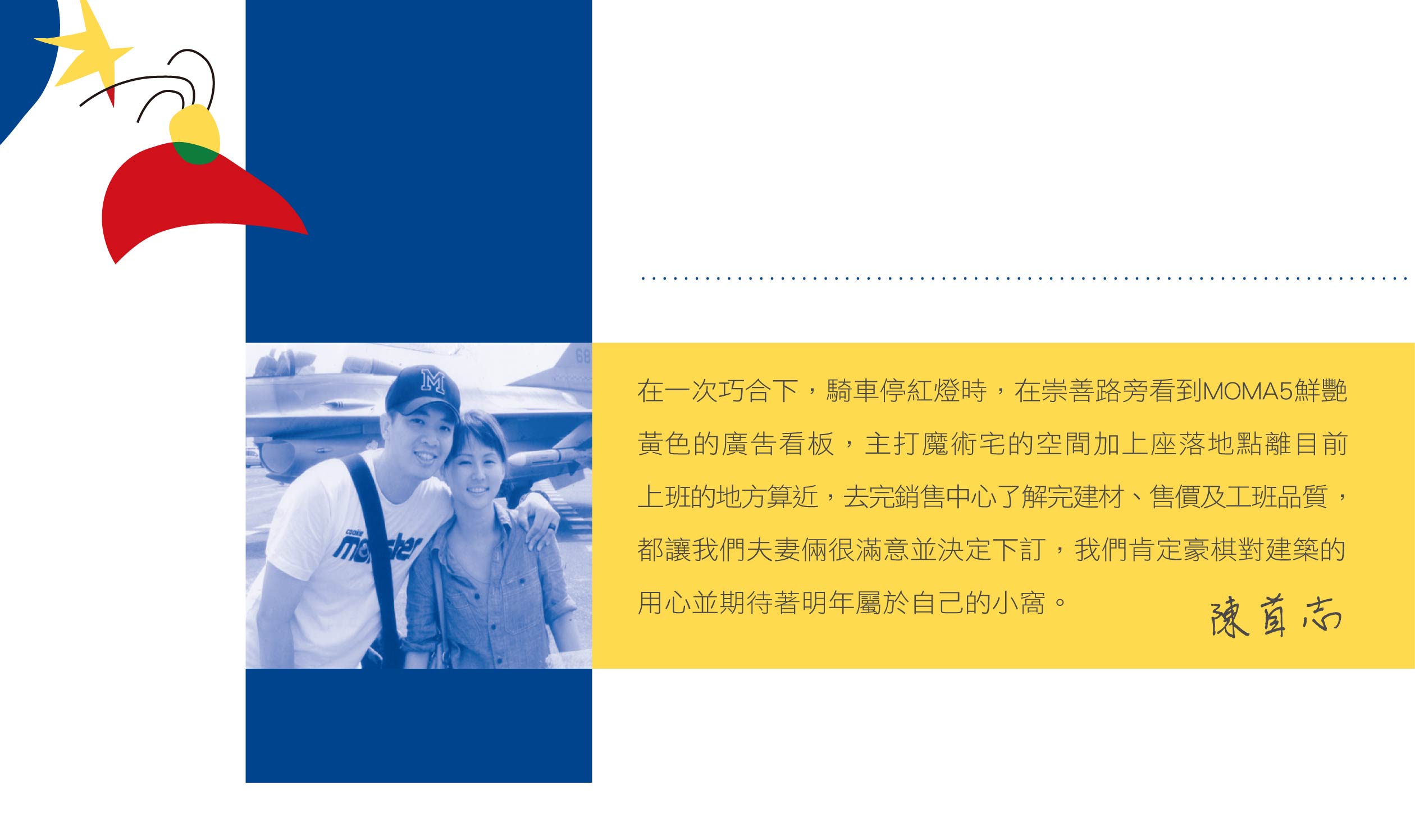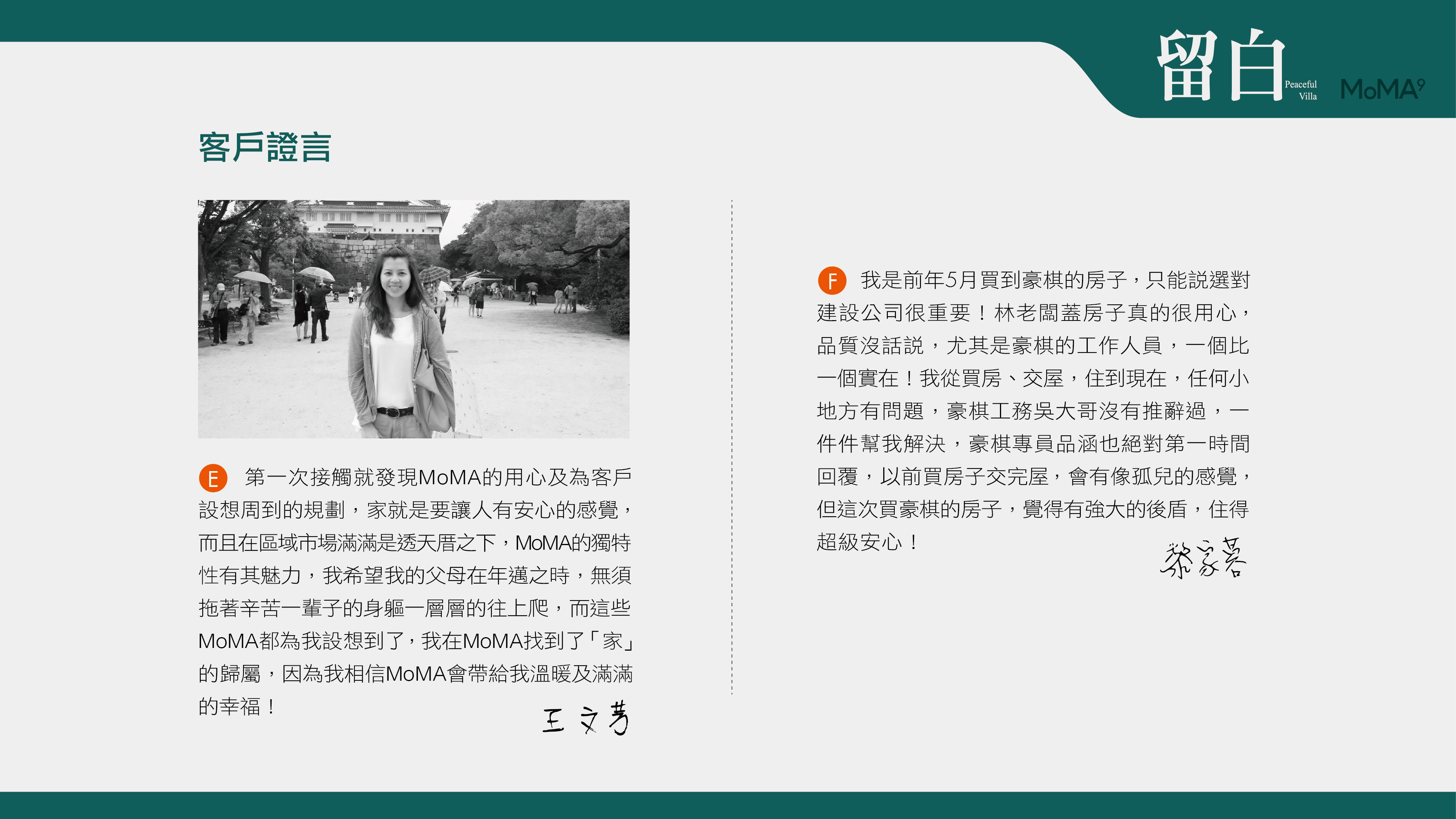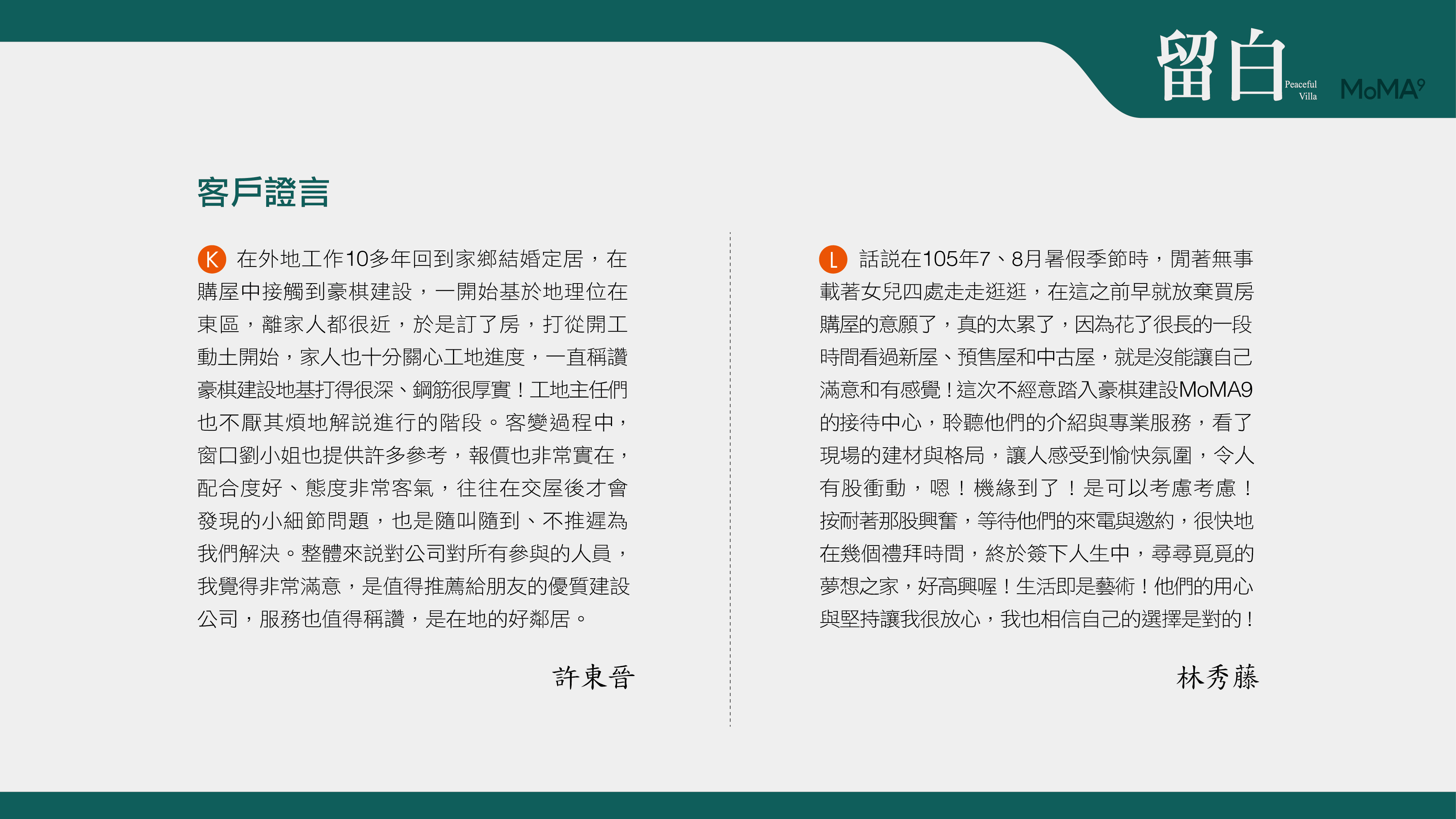 MoMA客戶薦言 【MoMA 1號.2號 作品】東區-2012年10月 【 MoMA 3號作品】東區-2013年3月 【MoMA 5號作品】東區-2013年5月 【MoMA 6號作品】東區-2015年10月 【MoMA 7號作品】東區-2015年10月 【MoMA 9號作品E區獨院透天-】東區-2016年9月 【MoMA 9號作品-G區精緻2房公寓】東區-2016年10月 【MoMA 11號作品-透天-歸仁真市心】歸仁區-2018年1月 【MoMA 12號作品-華廈-美美】歸仁區-2020年6月 【MoMA 12號作品-透天-築日】歸仁區-2020年7月 【MoMA 13號作品-透天-親親好墅】歸仁區-2020年3月 【MoMA 15號作品-獨院店住透天】東區-2020年12月 【MoMA 16號作品-精品透天】東區-2020年12月